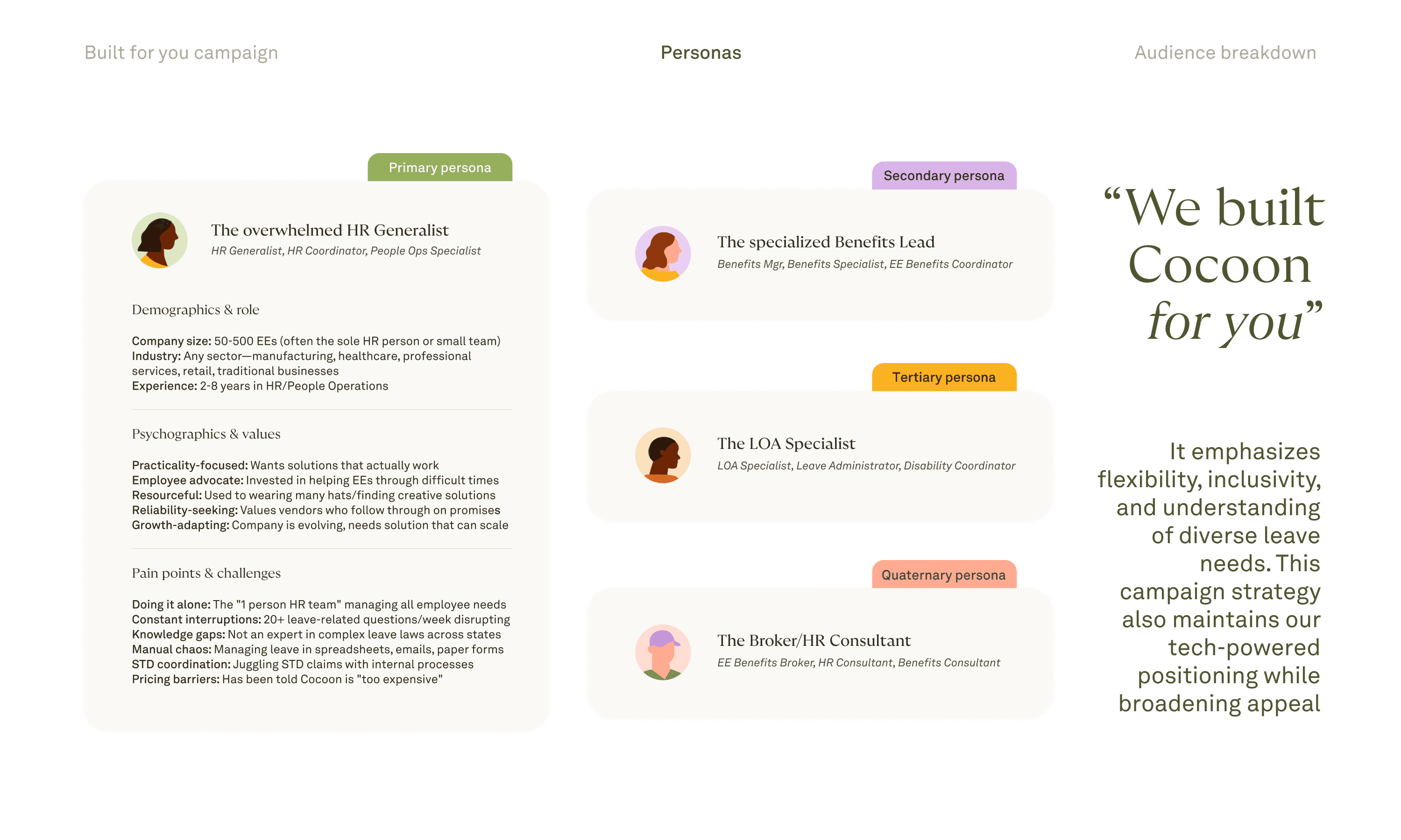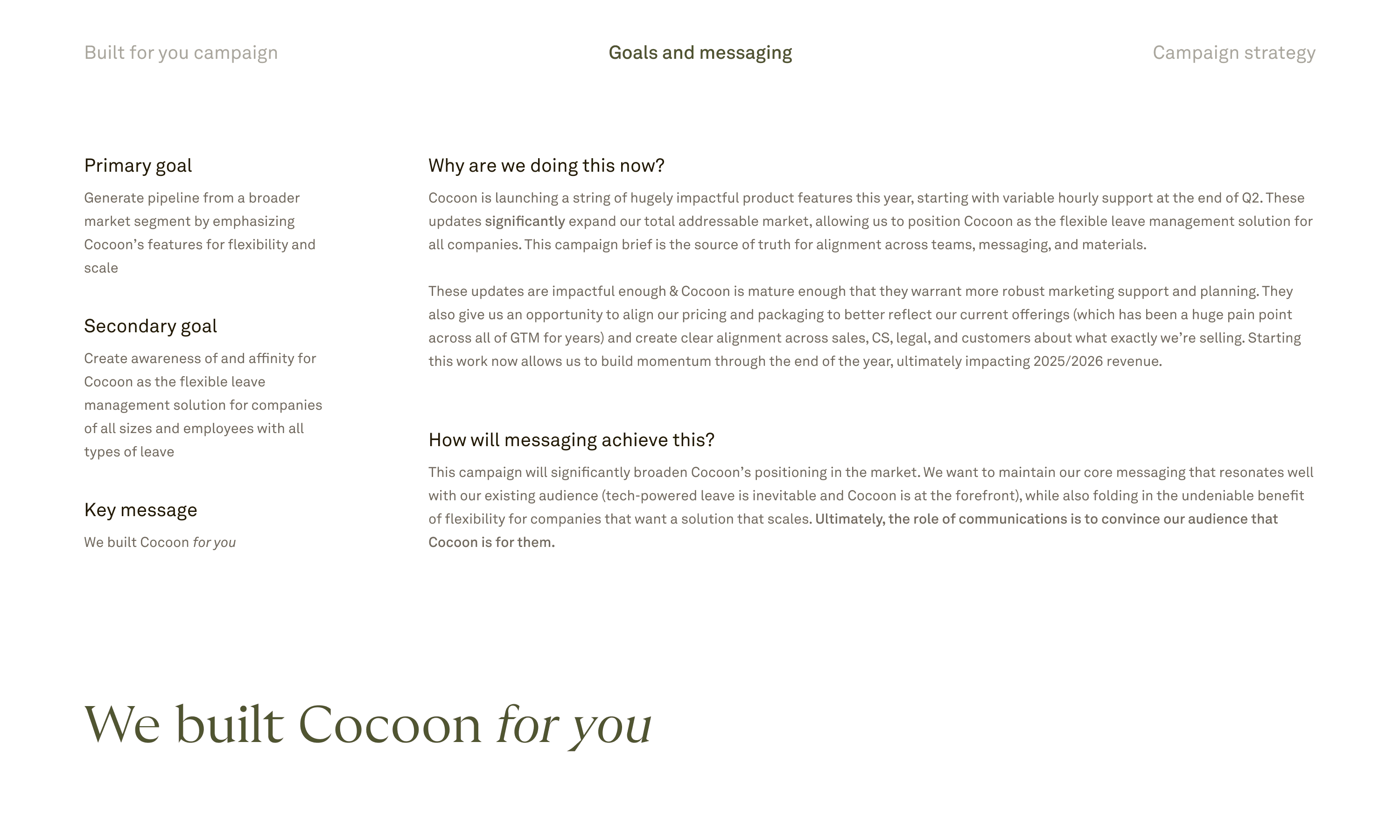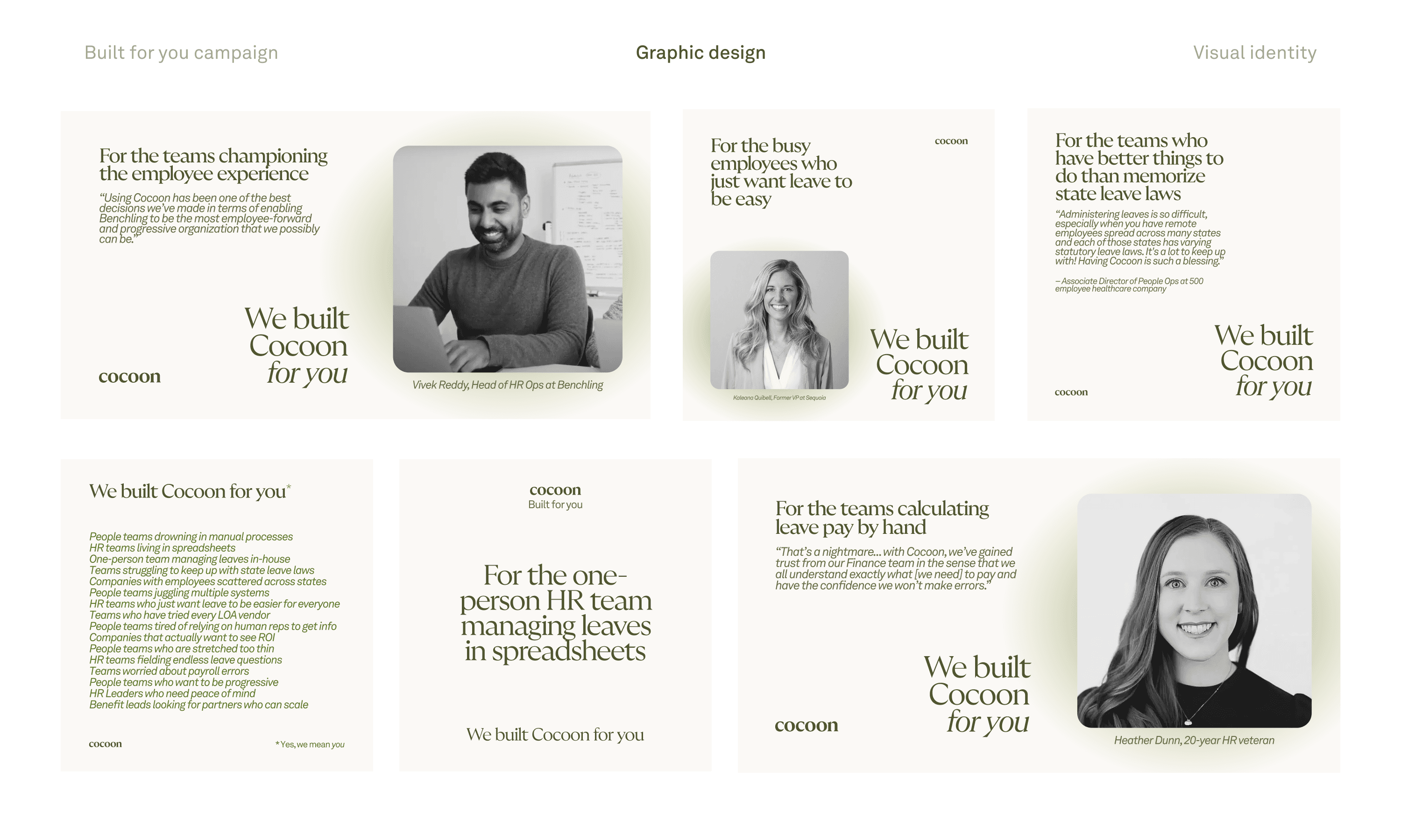 I wrote the brief, defined the messaging, and built (no pun intended) "Built for You" as Cocoon's company-wide brand campaign for H2 2025. The central idea: Cocoon isn't a one-size-fits-all solution. It's flexible technology built for the specific needs of your team, your employees, and your leave types.