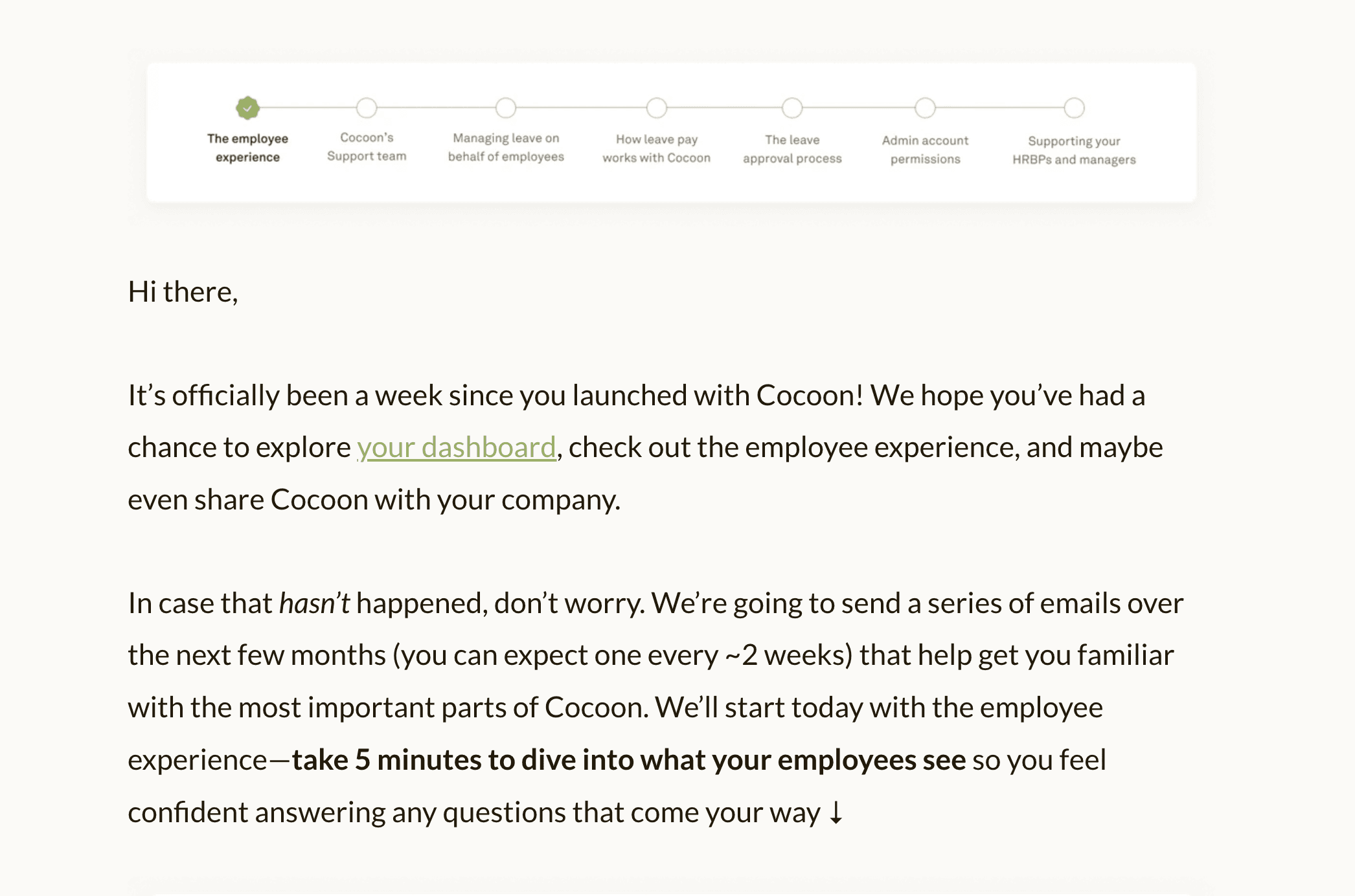 Every email was built around a single idea: this might feel like a new way to manage leave, but we've got you. The content was timed to key product milestones, written to build self-service habits, and designed to drive action before a customer would ever think to open a support ticket. I also built interactive product tour assets in Arcade that are now used in both the onboarding flow and the sales process.