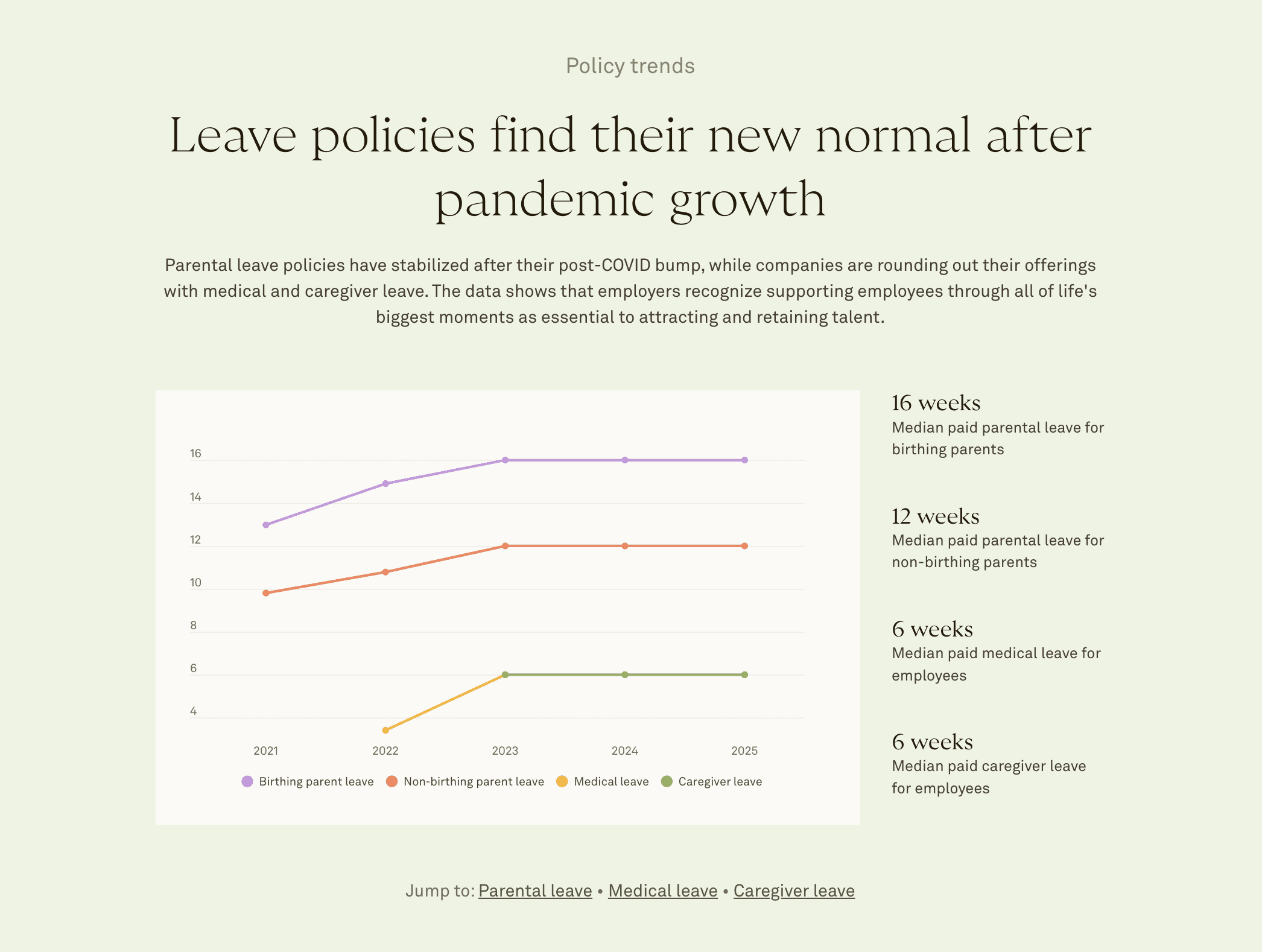 I owned the strategy and execution of the benchmark report each year, working with data science to surface the most compelling insights and shaping the narrative around what the data actually means for employers. The report covers parental, medical, and caregiver leave trends across company sizes and industries, with expert quotes from People leaders and clear takeaways designed to help HR teams make the case for better policies internally.